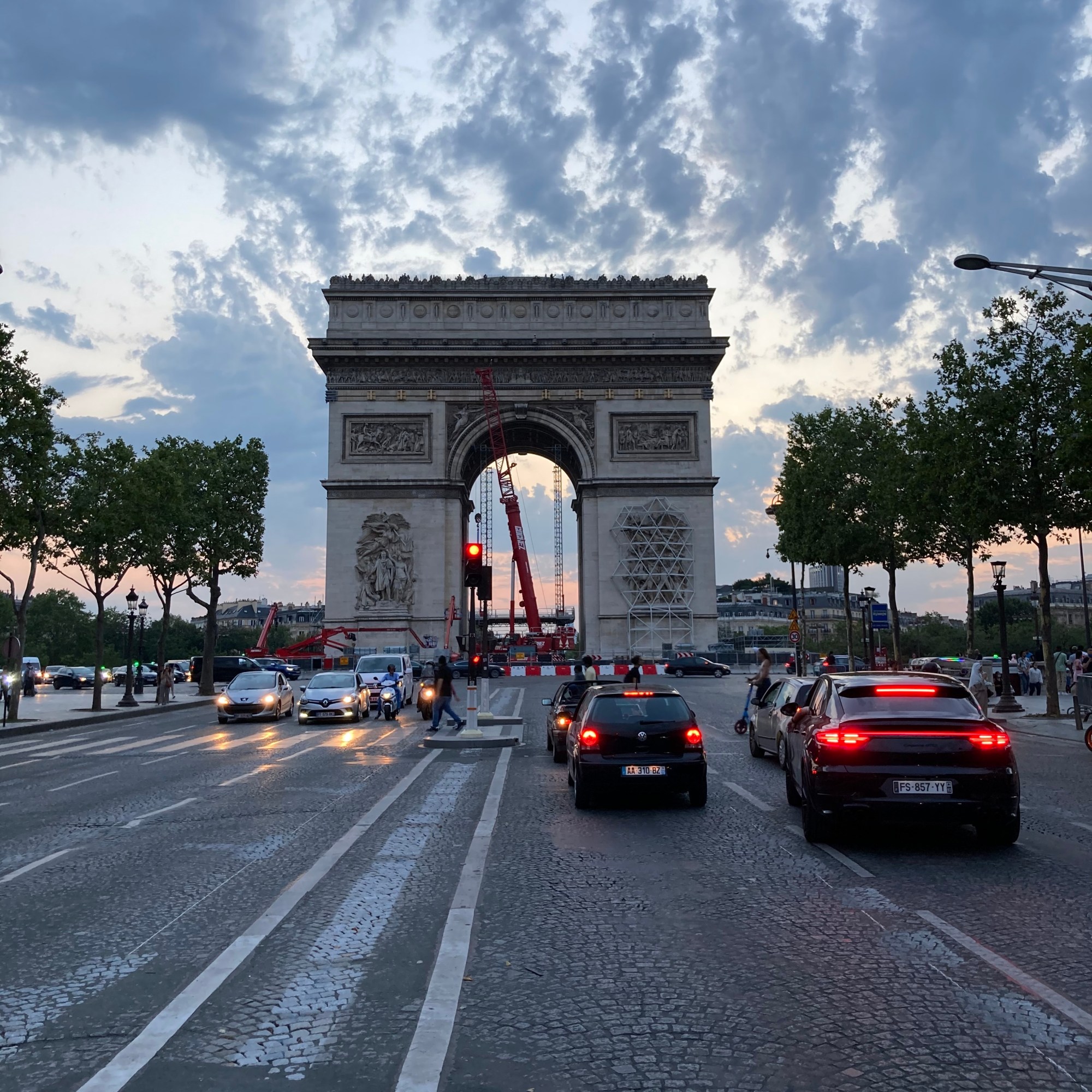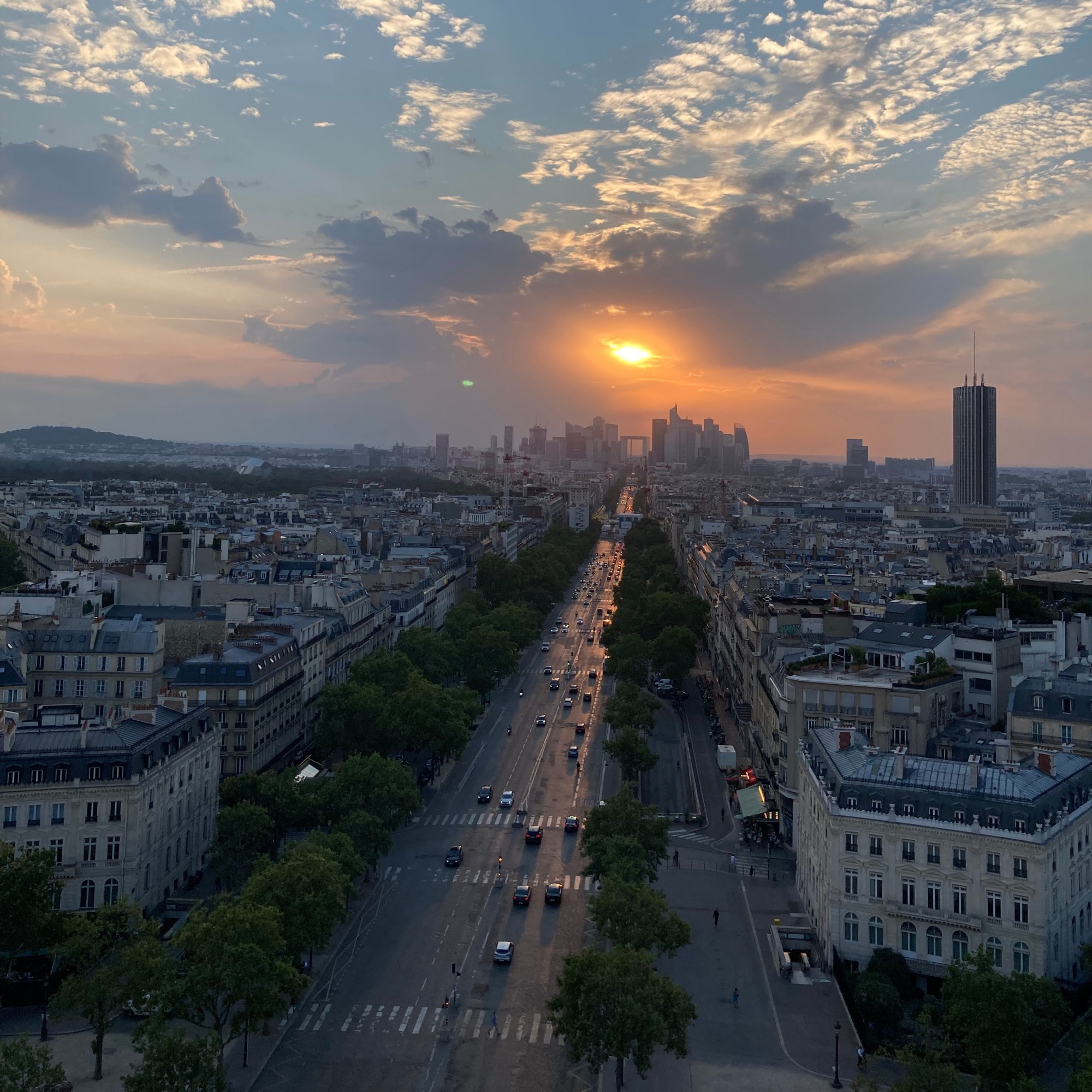 Beauvais oro uoste nusileidome apie 19 val., po 15-20 minučių jau sėdėjome autobuse, vežančiame į Paryžiaus centrą. Nuo Porte Maillot stoties, kur buvome išleisti, pėsčiomis nuėjome iki Triumfo arkos ir pakilome į jos viršų, kad dar spėtume pamatyti saulėlydį virš miesto bulvarų.