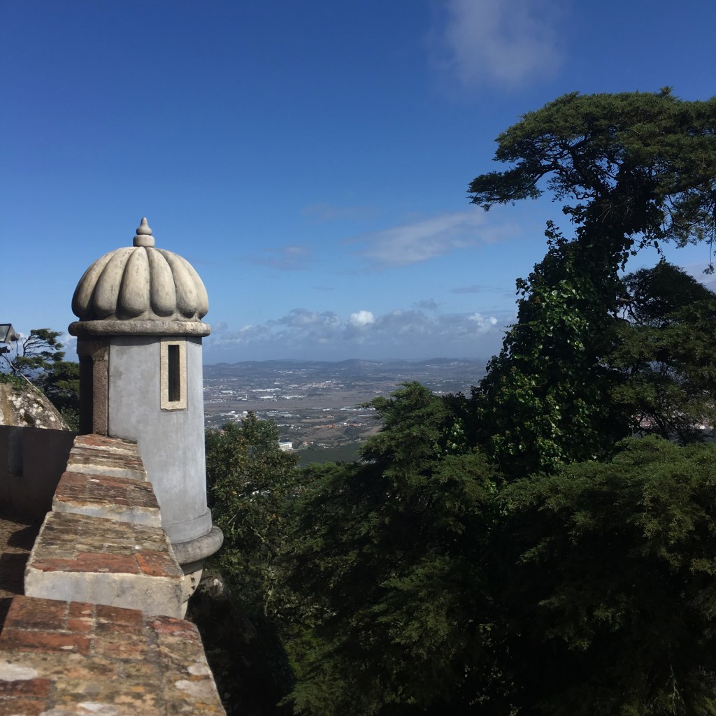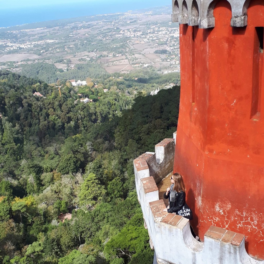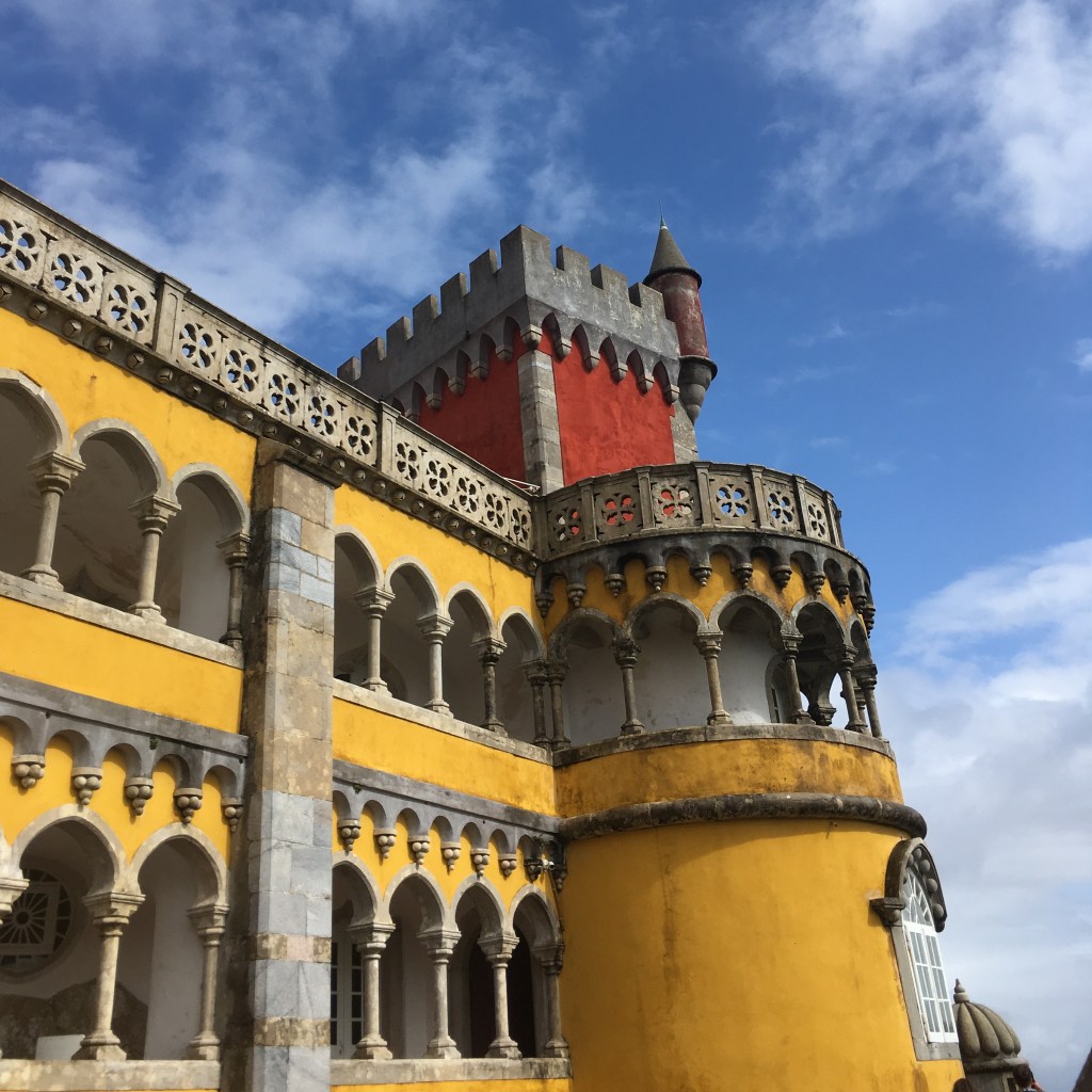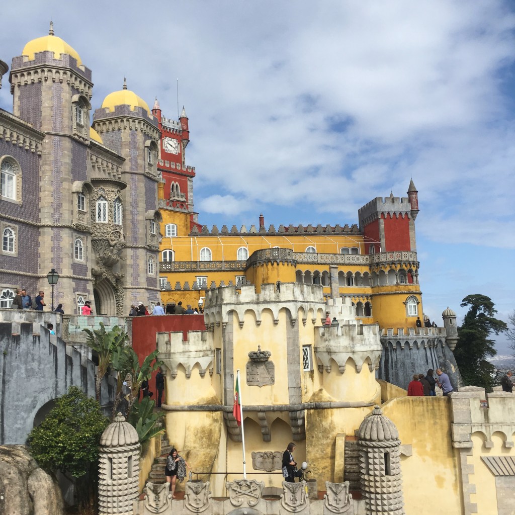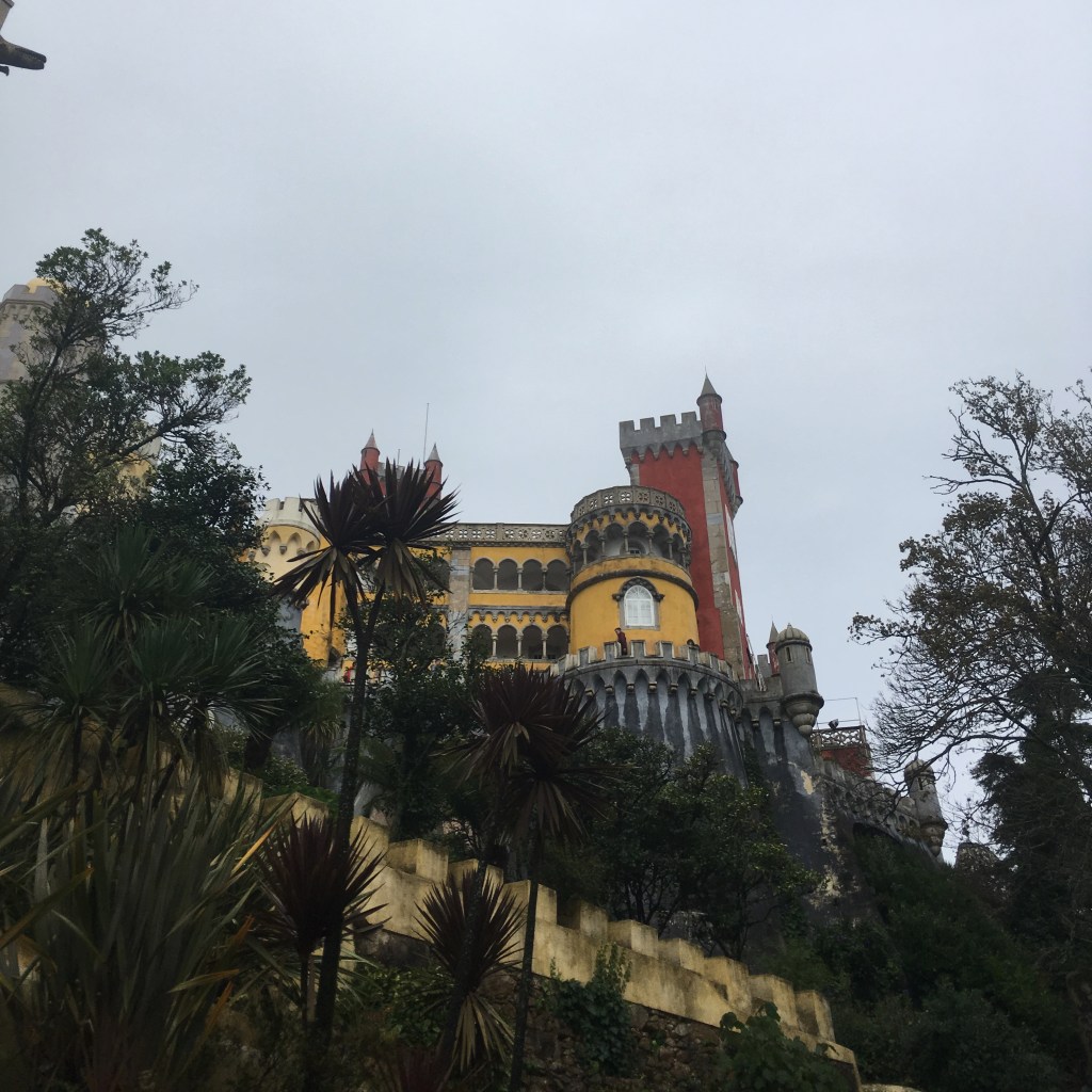Palácio da Pena – didžiulis eklektiškos architektūros ir ryškių spalvų statinys, iškilęs ant ganėtinai aukštos kalvos virš miestelio stogų. Pirmą kartą pamačiusi šiuos rūmus pakrikštijau juos Candy Crush (toks spalvotas mobiliųjų telefonų žaidimas, kurį tuo metu aktyviai žaidžiau) pilimi.
