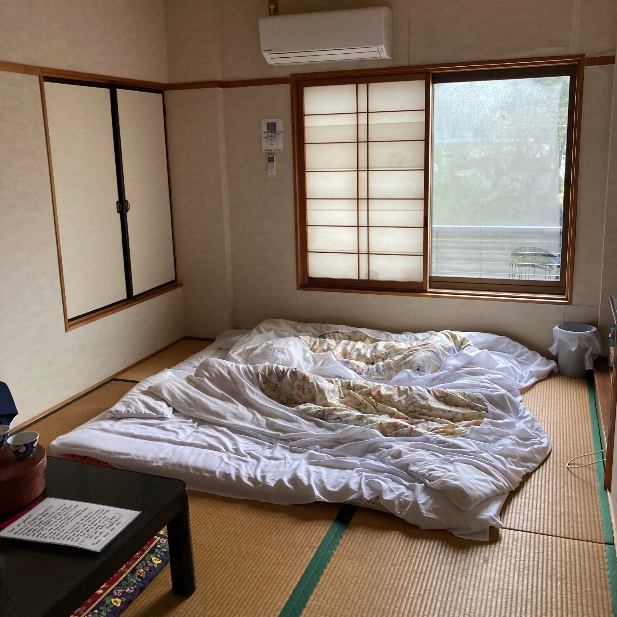 Kalnų miesteliuose apsistojome ryokan tipo namuose su atskirais kambariukais, bet bendrosiomis erdvėmis – valgomuoju, WC ir vonia. Juose miegoti teko ant čiužinio, patiesto ant grindų. Ten išmokome ir šlepečių dėvėjimo meno: įėjus į namus lauko batus reikia palikti prie durų ir apsiauti šlepetes. Su jomis keliaujama iki kambario, į kurį užeinama jau be šlepečių. O štai įeinant į WC reikia apsiauti specialiai šiam kambariui skirtas šlepetes.