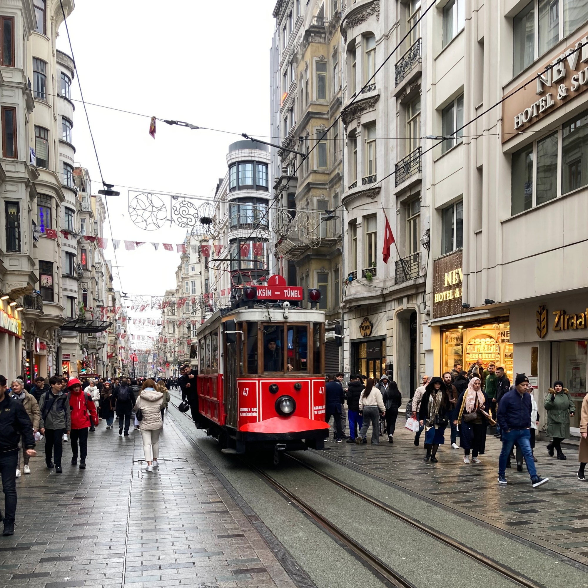 Sočiai prisivalgę pajudėjome nuo Taksim aikštės Istiklal gatve link Galata bokšto. Penktadienio popietę joje vaikščiojo tikrai nemažai žmonių – vis dėlto tai viena judriausių miesto gatvių. Ji skirta pėstiesiems, bet gatvės viduriu eina tramvajaus bėgiai, kuriais kartas nuo karto pravažiuoja labai fotogeniškas raudonas tramvajaus vagonėlis.