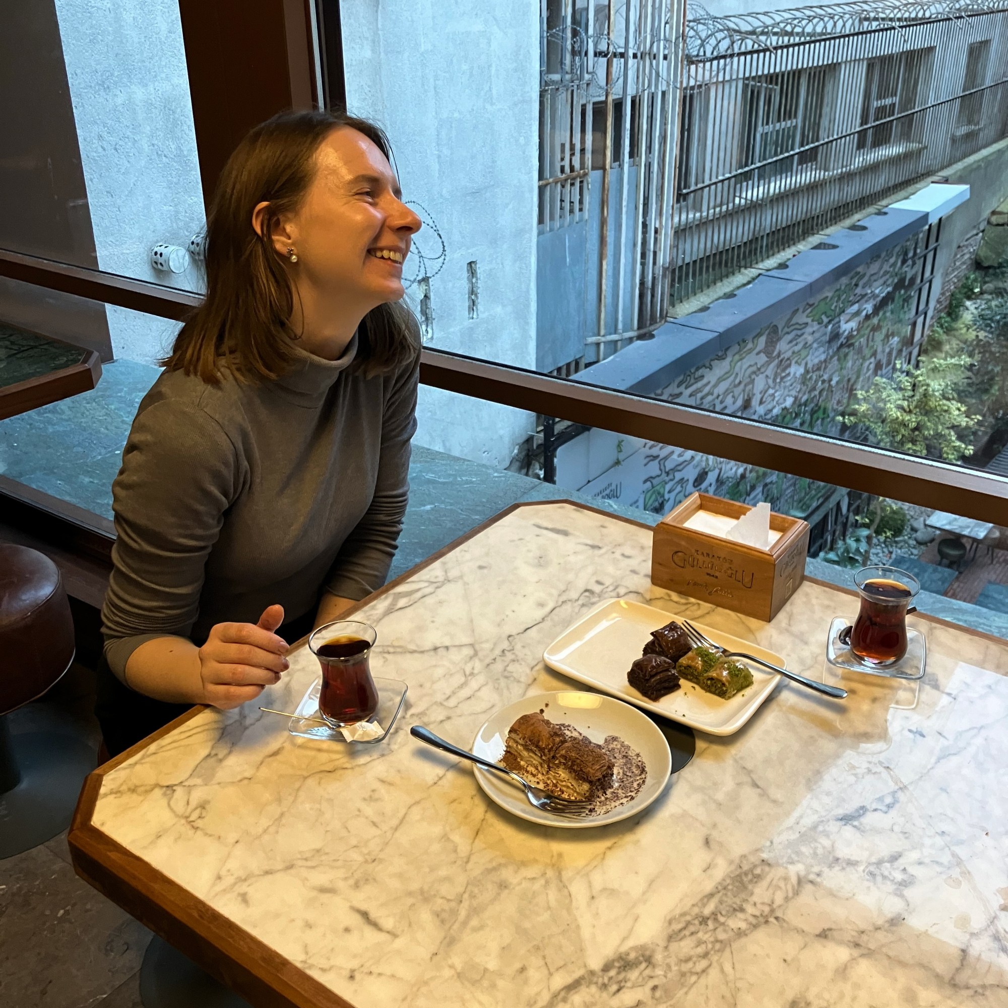 Žmonių minia mūsų per daug nedžiugino, tad stengėmės šį savo pasivaikščiojimo ruožą įveikti kuo greičiau. Kiek atsipūtėme atsiradę Karakoy rajone – nors žmonių ir čia buvo pakankamai, jie labiau pasiskirstė tarp jaukiai atrodančių parduotuvėlių ir kavinių. Ilgėliau sustojome Karakoy Gulluoglu paragauti vietinės baklavos ir išgerti arbatos. Labai patiko tiek skanėstai, tiek vietos atmosfera – tiesa, mano nuomone, verta užlipti į antrą aukštą ir įsitaisyti prie lango, kad būtų jaukiau.